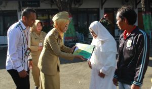 BREBESNEWS. co -Bupati Brebes Hj Idza Priyanti SE usai menjadi Pembina upacara Hari Jadi Jawa Tengah Senin (21/8/2017) memberikan santunan dari nilai manfaat kepesertaan Badan Penyelenggara Jaminan Sosial (BPJS) Ketenagakerjaan.