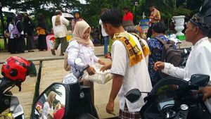 Kader PIRA Gerindra Brebes terlihat mebagi-bagikan susu ke para jemaah usai sholat Jumat di depan Masjid Agung Brebes