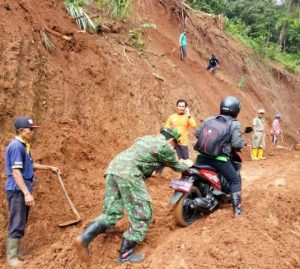 Pjs. Danramil 13 Salem, Pelda Jahri di lokasi karya bakti menyayakan, TNI dan elemen gabungan dari dua kecamatan yaitu Salem dan Banjarharjo, berhasil membuka akses, meski dengan peralatan manual.
