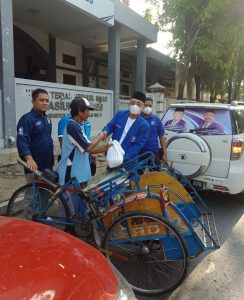Kader PAN Brebes saat berbagi sembako kepada anang tukang becak sebagai orang yang terdampak PPKM