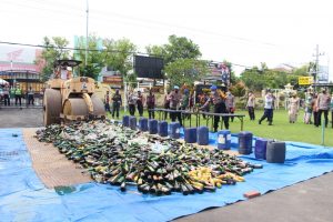 BREBESNEWS.co – Mengakhiri tahun 2021, lebih kurang 6.000 botol minuman keras (Miras) dari berbagai merk dimusnahkan Kepolisian Resort (Polres) Brebes.